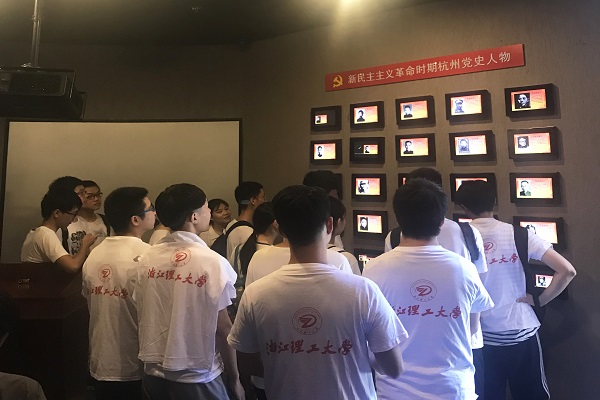 实践小分队一行19人来到了位于杭州市上城区方古园3号,展陈面积约850平方米的中共杭州小组纪念馆。纪念馆隐藏在小营巷中,外面看上去似乎就是一处普通的江南名居,却是当年我省第一个地方党组织——中共杭州小组的诞生地。纪念馆入口处最明显的便是头顶五角星造型结合杭州地图所塑造的星光般的视觉效果,以此处为开始,实践团成员们有序安静的进行参观,通过馆内传统和声、光、电等现代科技化手段相结合的展示来学习红色文化,了解到了四个展厅所向我们再现的浙江省第一个党的地方组织——中共杭州党小组创建、发展、壮大以及最终形成燎原之势的全过程。走至纪念馆内的露天庭院,庭院内树立着一座巨大的、以一面迎风飘扬的党旗为背景的雕塑,同时塑造了杭州党小组的创始人及三位小组成员的伟岸形象。庭院内还有一间玻璃的活动厅,许是红色的气氛激发了实践团成员们的激情,大家纷纷建议在活动厅合唱红歌,将一首《没有共产党就没有新中国》送给了党。歌声表达出实践团成员们的爱党爱国之情,展现出了新时代大学生风采。