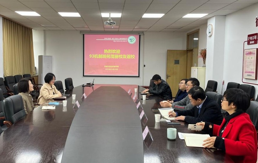 1993级机制专业校友、杭州恒胜电子科技有限公司总经理何茂丽回访母校。学院党委书记苏志俭出席会议,副院长吴震宇、党委副书记王吴芳、校招生与就业指导处副处长丁宁、服装学院党委副书记方水明、学院校友联络中心主任高君参加座谈。