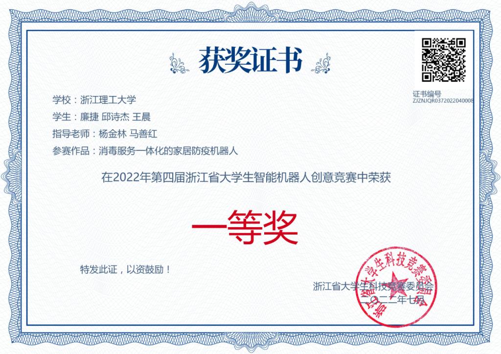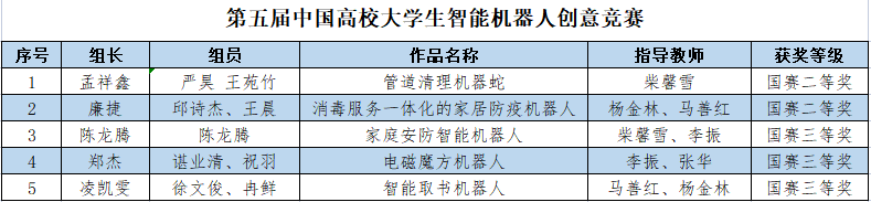 学子孟祥鑫、严昊、王苑竹的“管道清理机器人”,廉捷、邱诗杰、王晨的“消毒服务一体化的家居防疫机器人”,陈龙腾的“家庭安防智能机器人”,郑杰、谌业清、祝羽的“电磁魔方机器人”获得省赛一等奖。