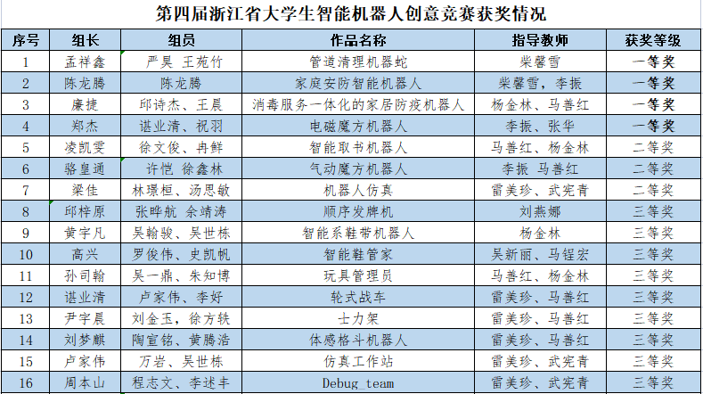 学子在第四届浙江省大学生智能机器人创意竞赛中斩获佳绩,获一等奖4项、二等奖3项、三等奖9项。