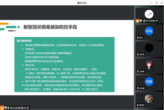 学生工作办公室制定《关于开展“科学防疫 平安返校”主题班会的通知》,下发并认真学习《针对新型冠状病毒感染的防护操作指南》。要求各班班级干部在学懂悟透的基础上,在班会过程中从个人常态化健康监测到感染者居家防疫的正确操作指南进行清晰与明确的讲解。在此基础上,还有班级通过观看科普视频对科学防护有了更深的理解和认识。主题班会上,同学们全面学习解读《浙江理工大学 2023 年春季学期学生返校告知书》,明确春季返校的流程和重点。
