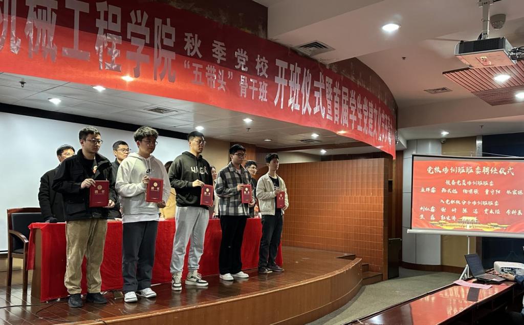 为进一步提高学生党员的综合素质,充分发挥新时代大学生党员的先锋模范和骨干带头作用,学院举办“青春心向党,奋进新征程”首届学生党建文化节,围绕强基固本-筑牢“红色堡垒”、守根铸魂-固紧“红色根基”、接续传承-点燃“红色引擎”、笃行致远-再创“红色传奇”四个篇章开展系列学生党建活动。同时,学院实施学生党员“五个带头”作用发挥承诺机制,成立“五带头骨干班”和“六进六讲”宣讲团。学校组织部(统战部)干部张维标老师为宣讲团代表授旗。